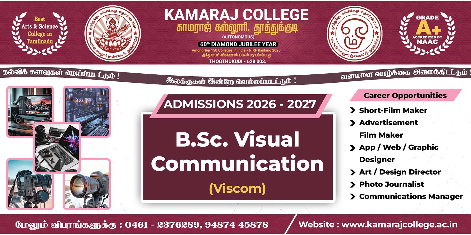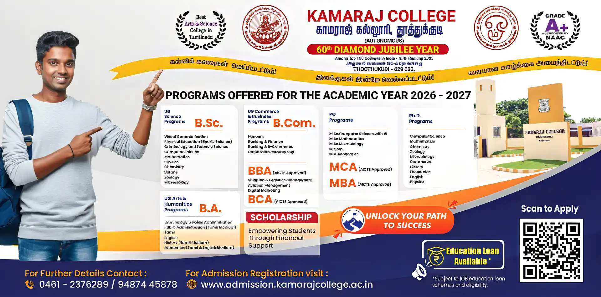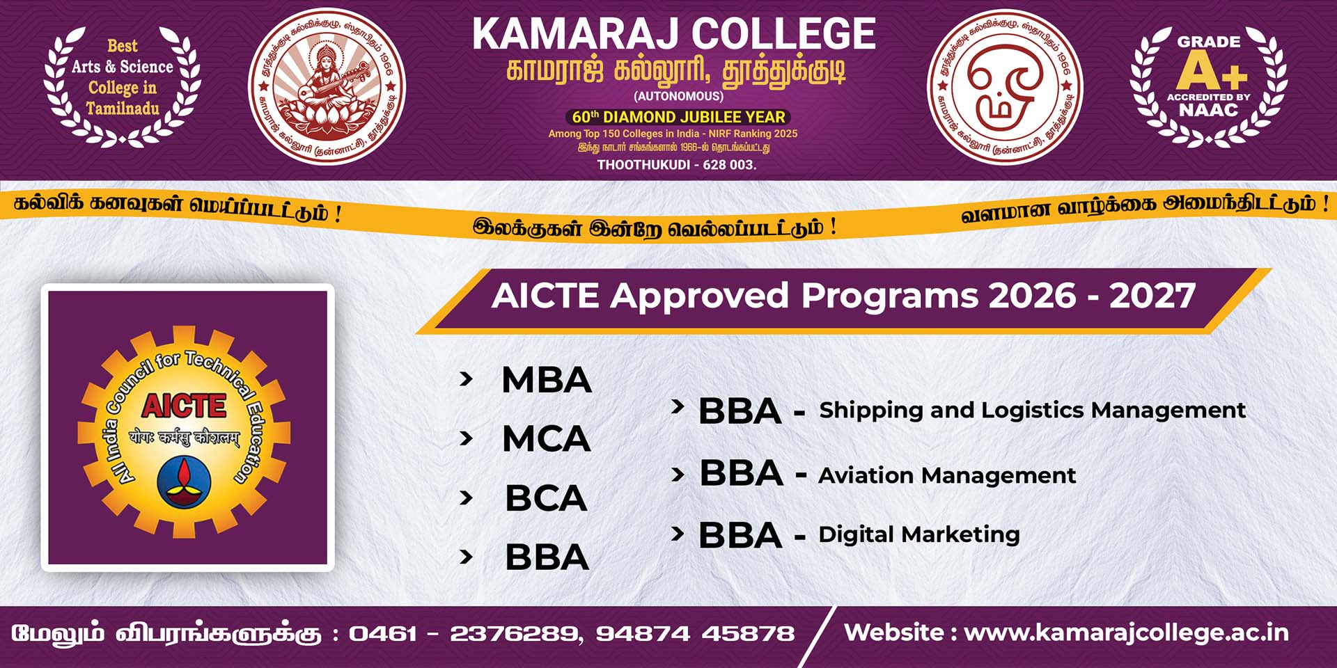 .Kamaraj College is a vibrant and friendly community that enjoys the reputation of being one of the most respected and admired educational institutions in southern Tamil Nadu.