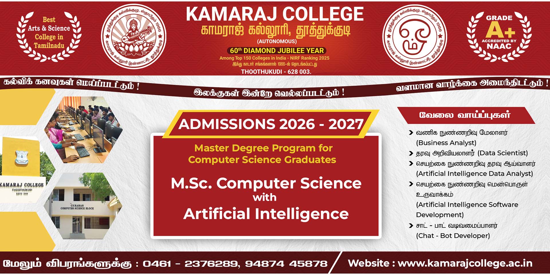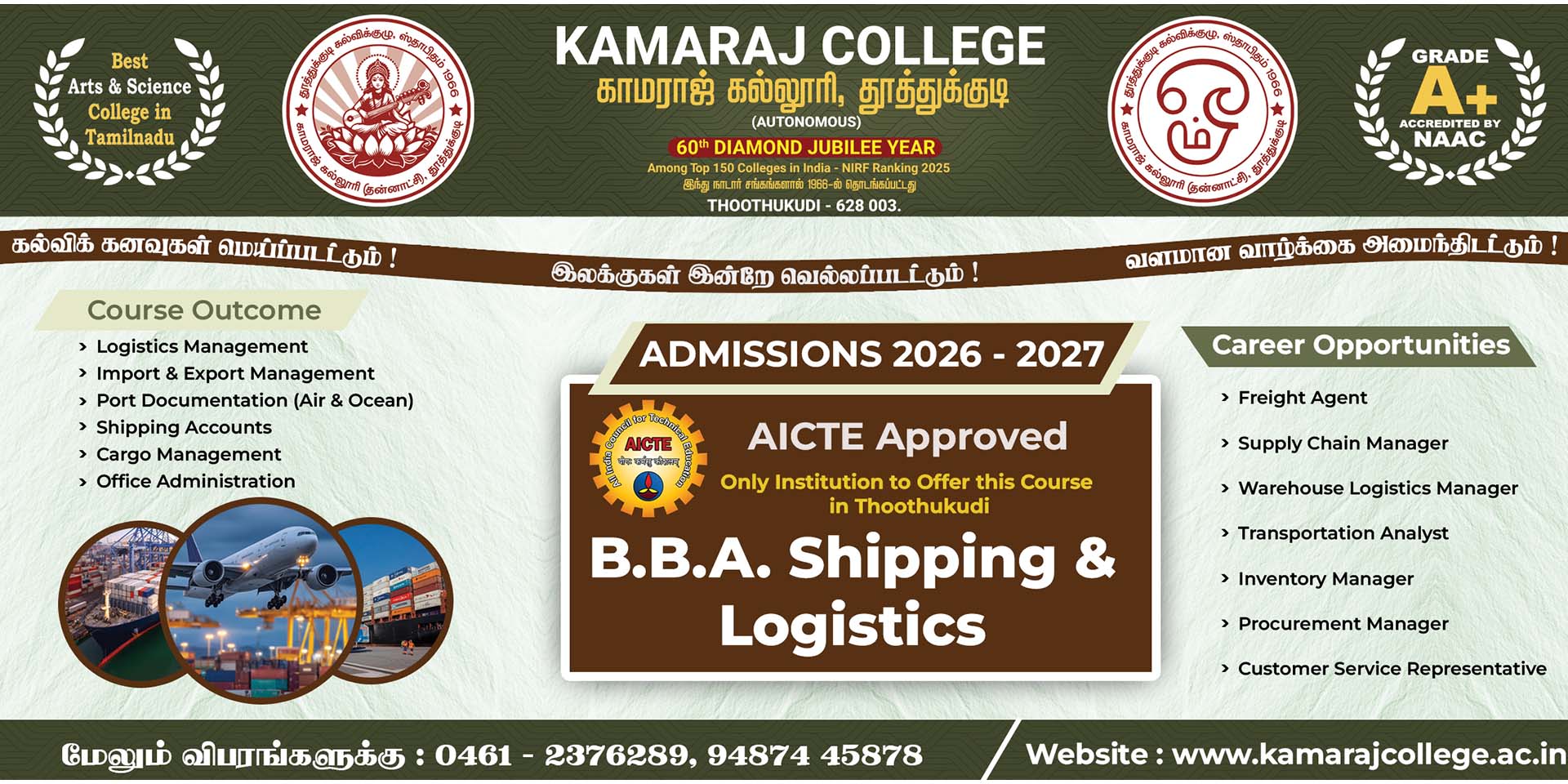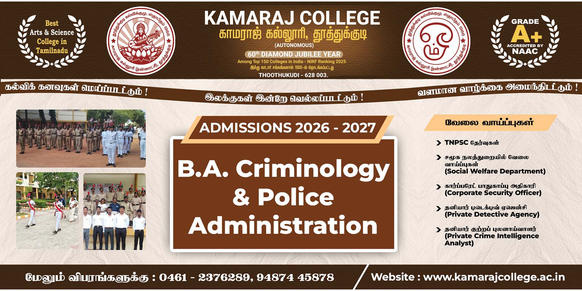 .Kamaraj College is a vibrant and friendly community that enjoys the reputation of being one of the most respected and admired educational institutions in southern Tamil Nadu.
