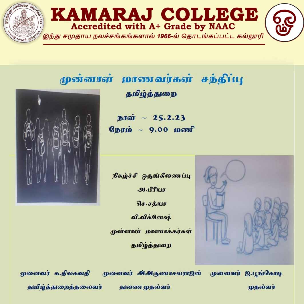 25.2.23 காமராஜ் கல்லூரி தமிழ்த்துறை சுயநிதிப் பிரிவின் சார்பாக முன்னாள் மாணாக்கர்கள் சந்திப்பு நடைபெற்றது. முன்னாள் மாணாக்கர்கள் மகிழ்வோடு கலந்து கொண்டனர். தமிழ்த்தாய் வாழ்த்தோடு நிகழ்வு இனிதே தொடங்கியது. முன்னாள் மாணாக்கர்கள் துணைமுதல்வர் முனைவர் அ.அருணாசலராஜன் அவர்களை கௌரவித்தனர். முதலாம் ஆண்டு மாணவி க.அஸ்வதி ராதா வரவேற்புரை ஆற்றினார். துணை முதல்வர் முனைவர் அ. அருணாசலராஜன் அவர்கள் சிறப்புரையாற்றினார். முன்னாள் மாணாக்கர்கள் தமிழ்துறைக்குப் புத்தகங்களைப் பரிசாக வழங்கினர். தமிழ்த்துறைத் தலைவர் முனைவர் க.திலகவதி முன்னாள் மாணாக்கர்களை வரவேற்று பேசினார். தமிழ்த்துறை இந்நாள் மாணாக்கர்களோடு முன்னாள் மாணாக்கர்கள் கலந்துரையாடினர். தமிழ்த் துறைப் பேராசிரியர்கள் கலந்து கொண்டு சிறப்பித்தனர். முன்னாள் மாணவி அ.பிரியா, முன்னாள் மாணாக்கர்கள் சந்திப்பு நிகழ்வை ஏற்பாடு செய்திருந்த கல்லூரி நிர்வாகம், முதல்வர் முனைவர் ஜ. பூங்கொடி, துணை முதல்வர் முனைவர் அ.அருணாசலராஜன் அவர்களுக்கு நன்றியைத் தெரிவித்தார். நாட்டுப்பண்ணோடு நிகழ்வு நிறைவடைந்தது.