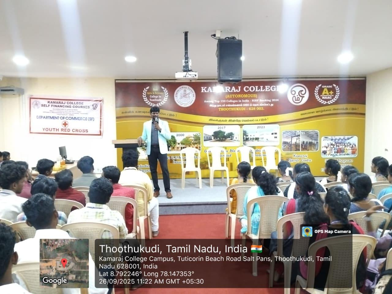 The Drug Awareness Program Kamaraj College Commerce Department was successfully organized on 26th September 2025 in collaboration with the Youth Red Cross (YRC). The event was designed to create awareness among students about the dangers of drug abuse and its far-reaching consequences on mental health, academic performance, family relations, and career prospects. The program provided a platform for students to understand preventive strategies, gain practical knowledge, and develop skills to lead a responsible and healthy lifestyle. By participating in this program, students were empowered to make informed decisions and contribute positively to society.
