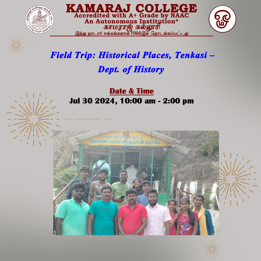 On behalf of the Department of History organised a one day field trip to Historical places in Tenkasi district on 30-07-2024.On this trip our III History students visited Coutralam kutralanathar swamy temple, Panpoli kumara swamy temple,Thoranamalai Sri murugan Temple.