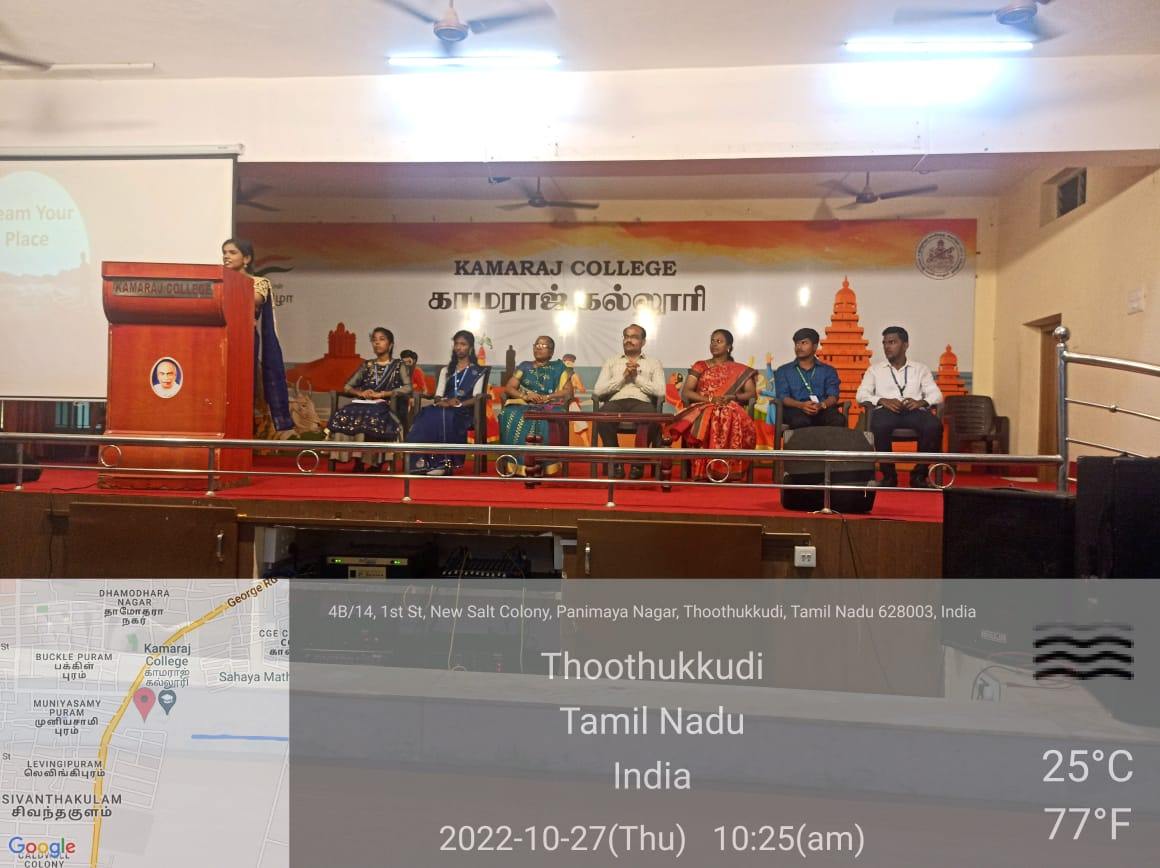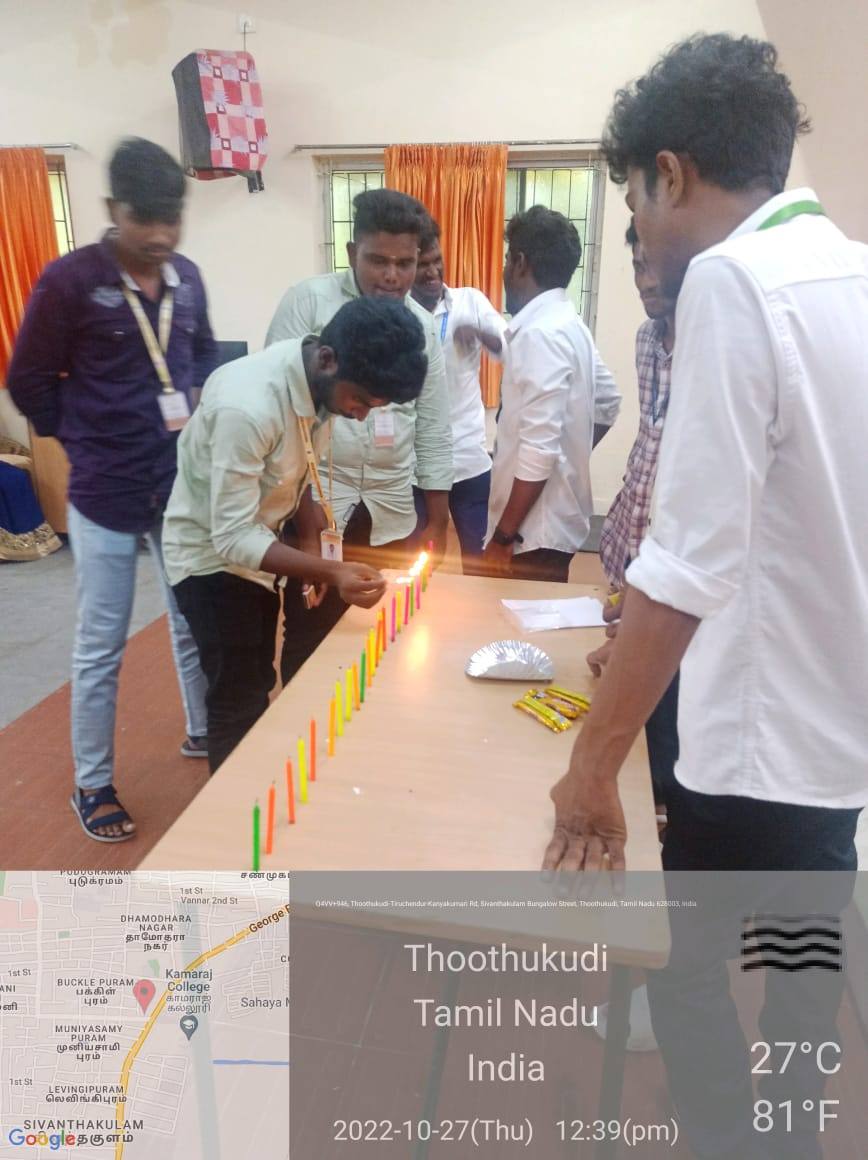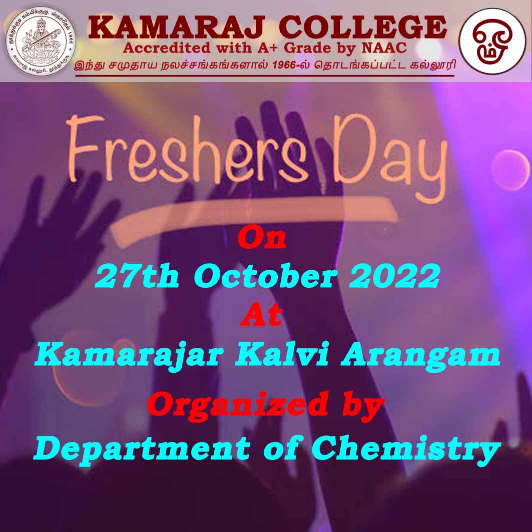 The Department of Chemistry organized its Association meeting cum Freshers day on 27.10.2022 at Kamarajar Kalvi Arangam. Ms. P. Divyashree of III B.Sc. Chemistry welcomed the gathering. The Chief Guest of today’s program was Dr. I. Abulkalam Azath, Assistant Professor of Chemistry, Aditanar College, Tiruchendur and he delivered a lecture on the topic “Career Opportunities”. Our Department’s senior students conducted a quiz program, a connection game related to chemistry, lighting the candle, etc., and made their juniors active participation with happiness in the events. Finally, Mr. C. Poyyamozhi of III B. Sc. Chemistry proposed a vote of thanks.