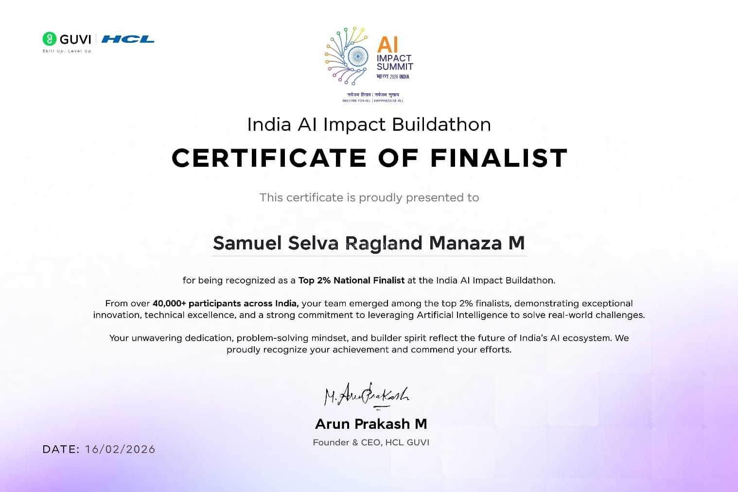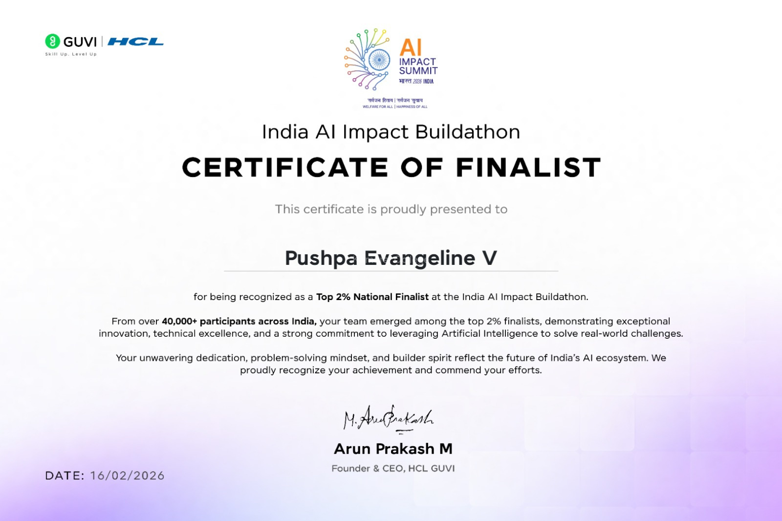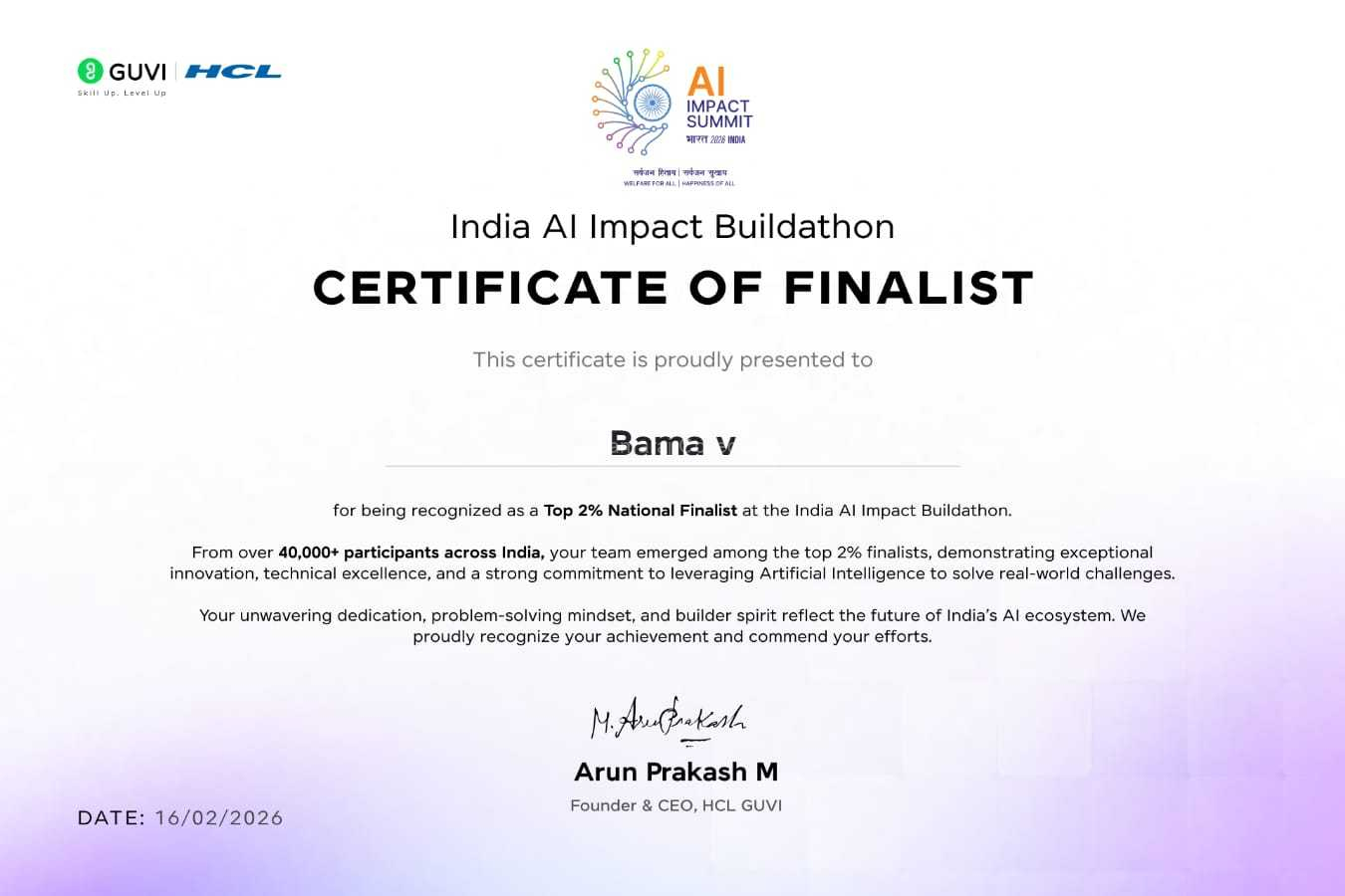 On 16 February 2026, from 09.30 a.m. to 02.00 p.m., the Department of Computer Science (SF) of Kamaraj College (Autonomous), Thoothukudi achieved remarkable recognition at the India AI Buildathon, organized by GUVI in collaboration with HCL as part of the India AI Impact Summit 2026 held in New Delhi.