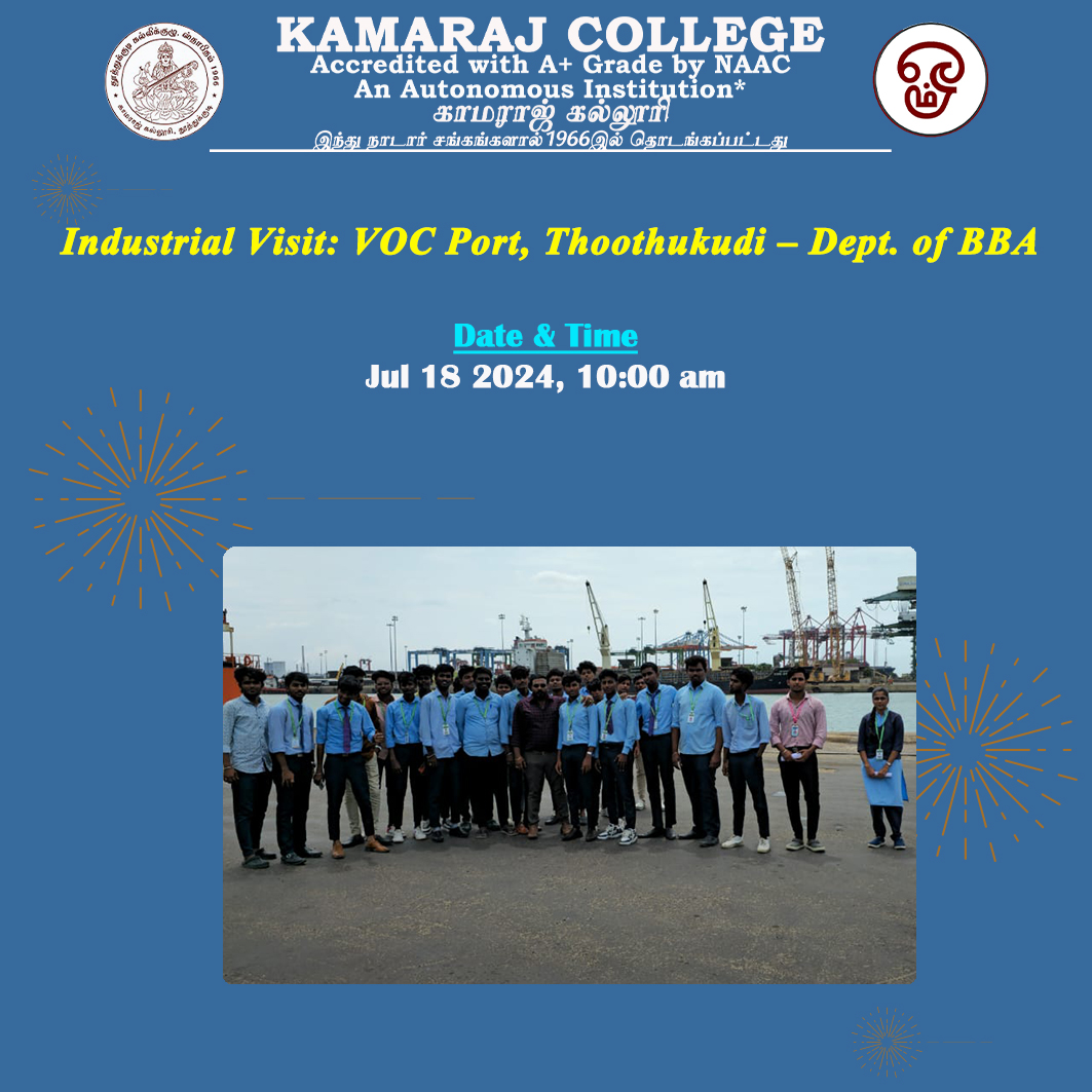 The Department of Business Administration, Kamaraj College has successfully organised the one day Industrial visit to V. O. Chidambaram Port, Thoothukudi on 18.07.2024.