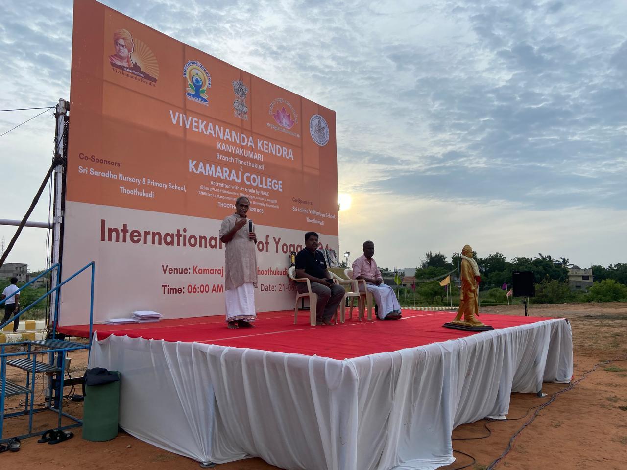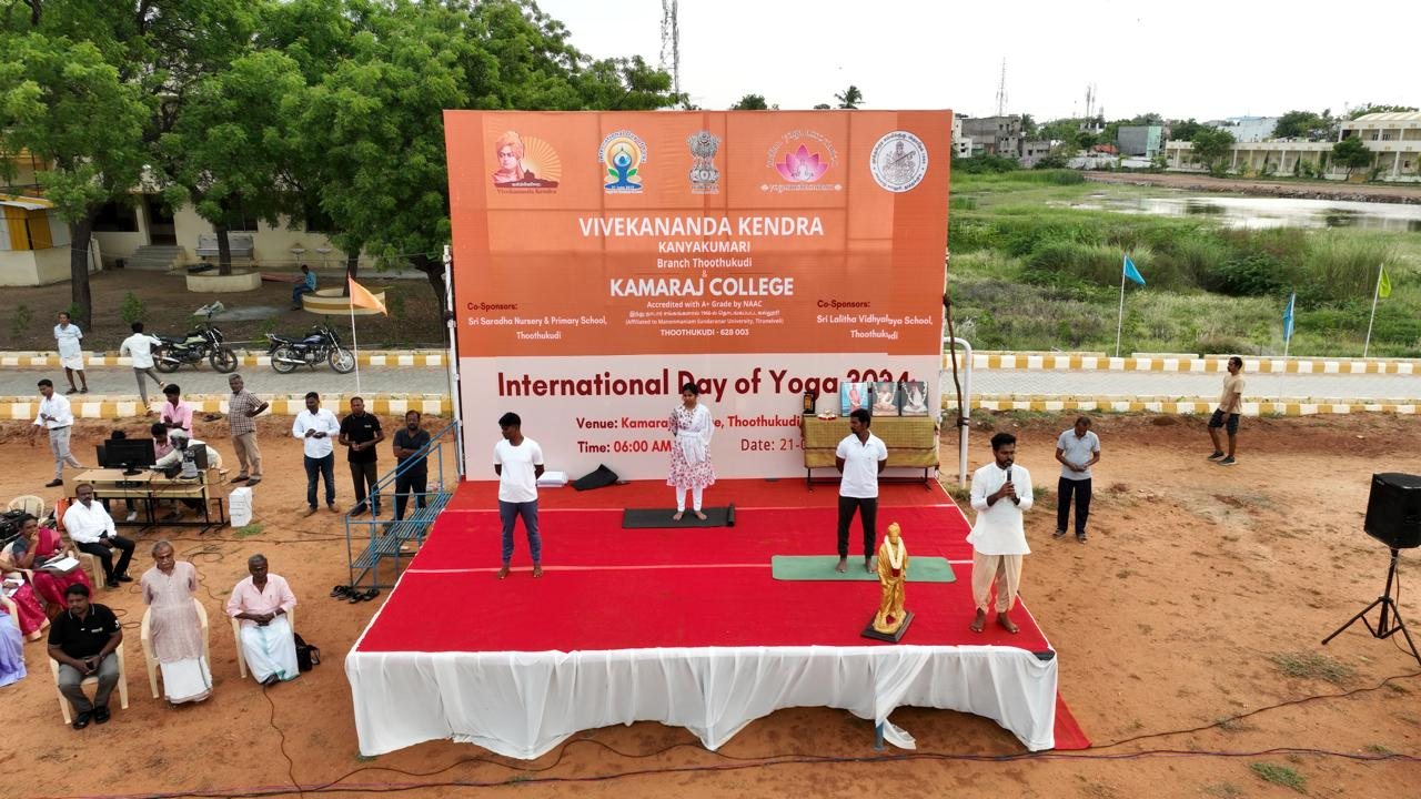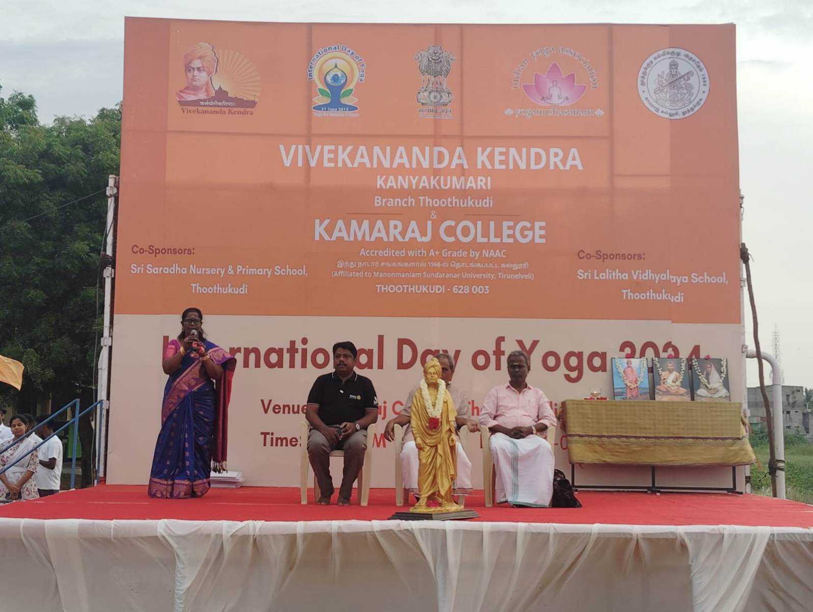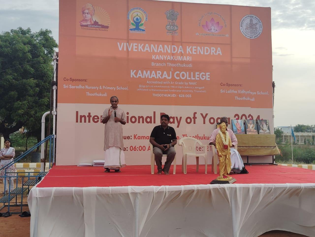 Vivekananda Kendra, Thoothukudi Branch and Kamaraj College jointly organised an “International Day of Yoga 2024” on Friday 21.06.2024 at 06:00 AM at Kamaraj College ground. The ceremony started with Shanti Mantra and Dr. J. Poongodi, Principal gave the welcome address. All India Vivekanada Kendra Vice President Mananeeya Shri. Hanumantha Rao delivered his speech about the role of yoga in protecting the body and mind. Nearly 800 students from various schools and our college were participated in this grand celebration and were taught preparatory exercises, asanas, pranayama, patanjali salutations. All the Schools and College students were received their participation certificates and institutions were honoured with the momento. Mr. M. Balamurugan, Secretary, Vivekananda Kendra, Thoothukudi delivered the vote of thanks. In this program, Vivekananda Kendra Thoothukudi Nagar Sanchalak Mrs. Subathra Vetrivel, Vivekananda Kendra Rural Development Programme – Secretary Mr. Ayyappan, faculty members of Kamaraj College were presented.