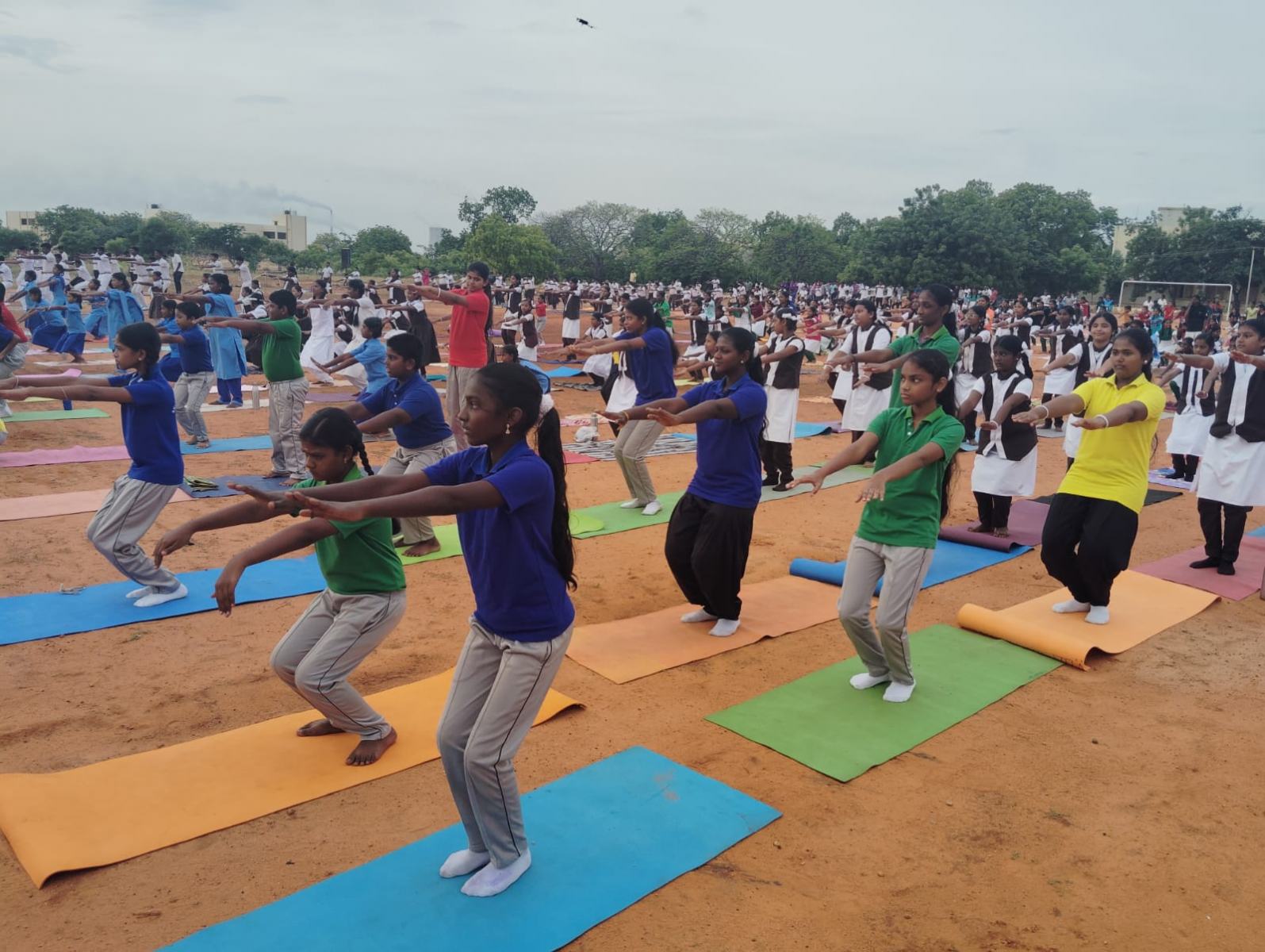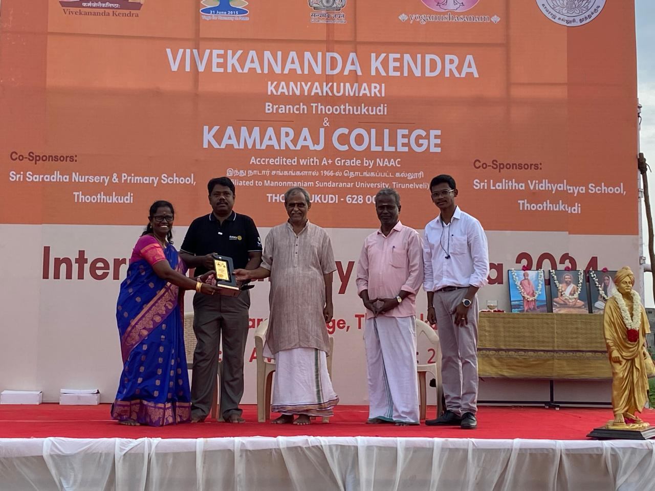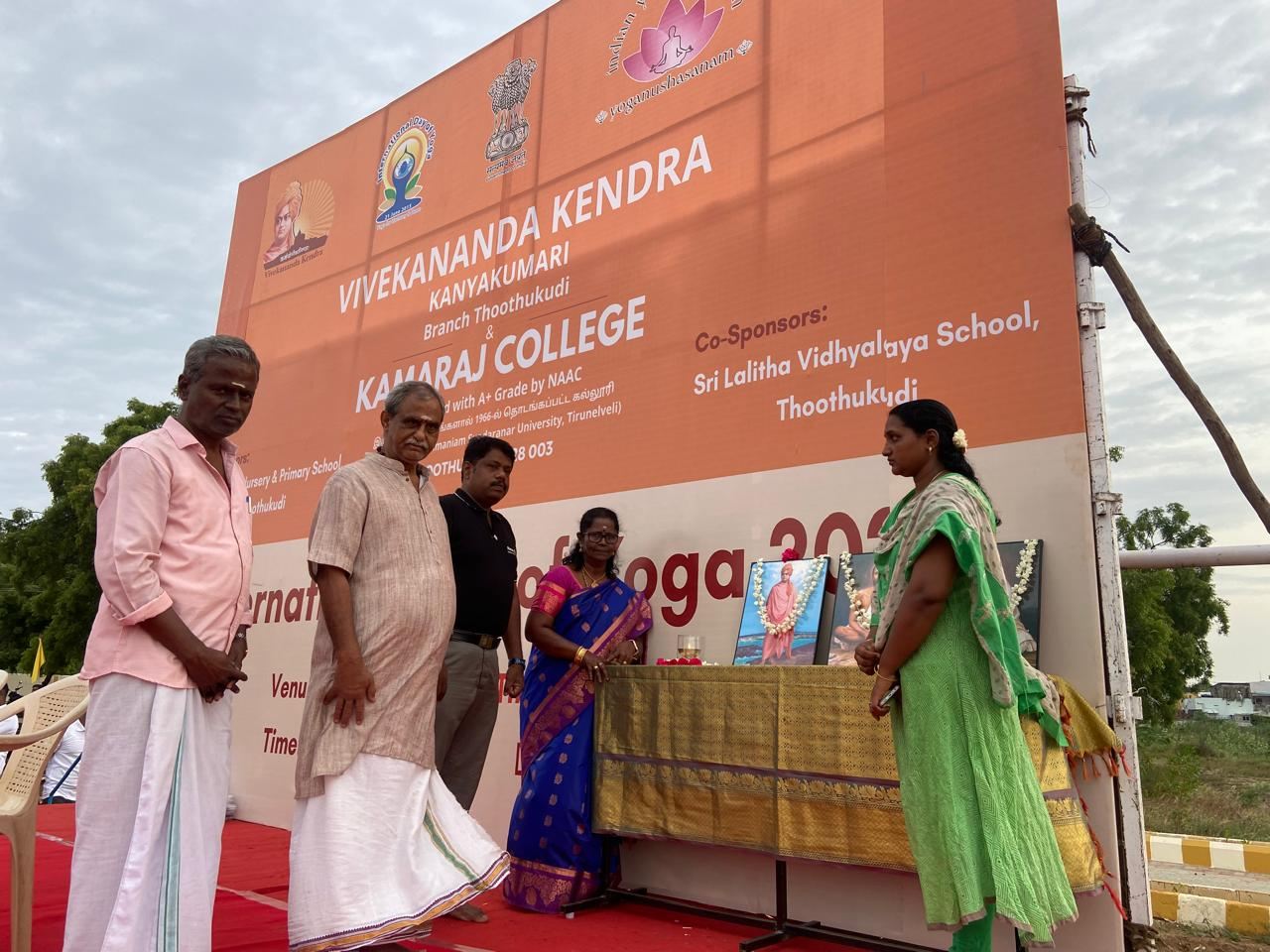 Vivekananda Kendra, Thoothukudi Branch and Kamaraj College jointly organised an “International Day of Yoga 2024” on Friday 21.06.2024 at 06:00 AM at Kamaraj College ground. The ceremony started with Shanti Mantra and Dr. J. Poongodi, Principal gave the welcome address. All India Vivekanada Kendra Vice President Mananeeya Shri. Hanumantha Rao delivered his speech about the role of yoga in protecting the body and mind. Nearly 800 students from various schools and our college were participated in this grand celebration and were taught preparatory exercises, asanas, pranayama, patanjali salutations. All the Schools and College students were received their participation certificates and institutions were honoured with the momento. Mr. M. Balamurugan, Secretary, Vivekananda Kendra, Thoothukudi delivered the vote of thanks. In this program, Vivekananda Kendra Thoothukudi Nagar Sanchalak Mrs. Subathra Vetrivel, Vivekananda Kendra Rural Development Programme – Secretary Mr. Ayyappan, faculty members of Kamaraj College were presented.