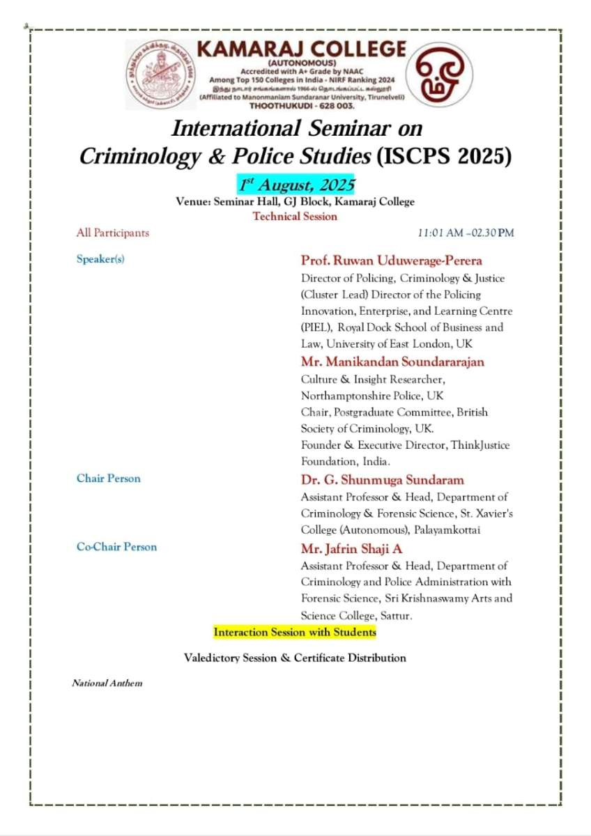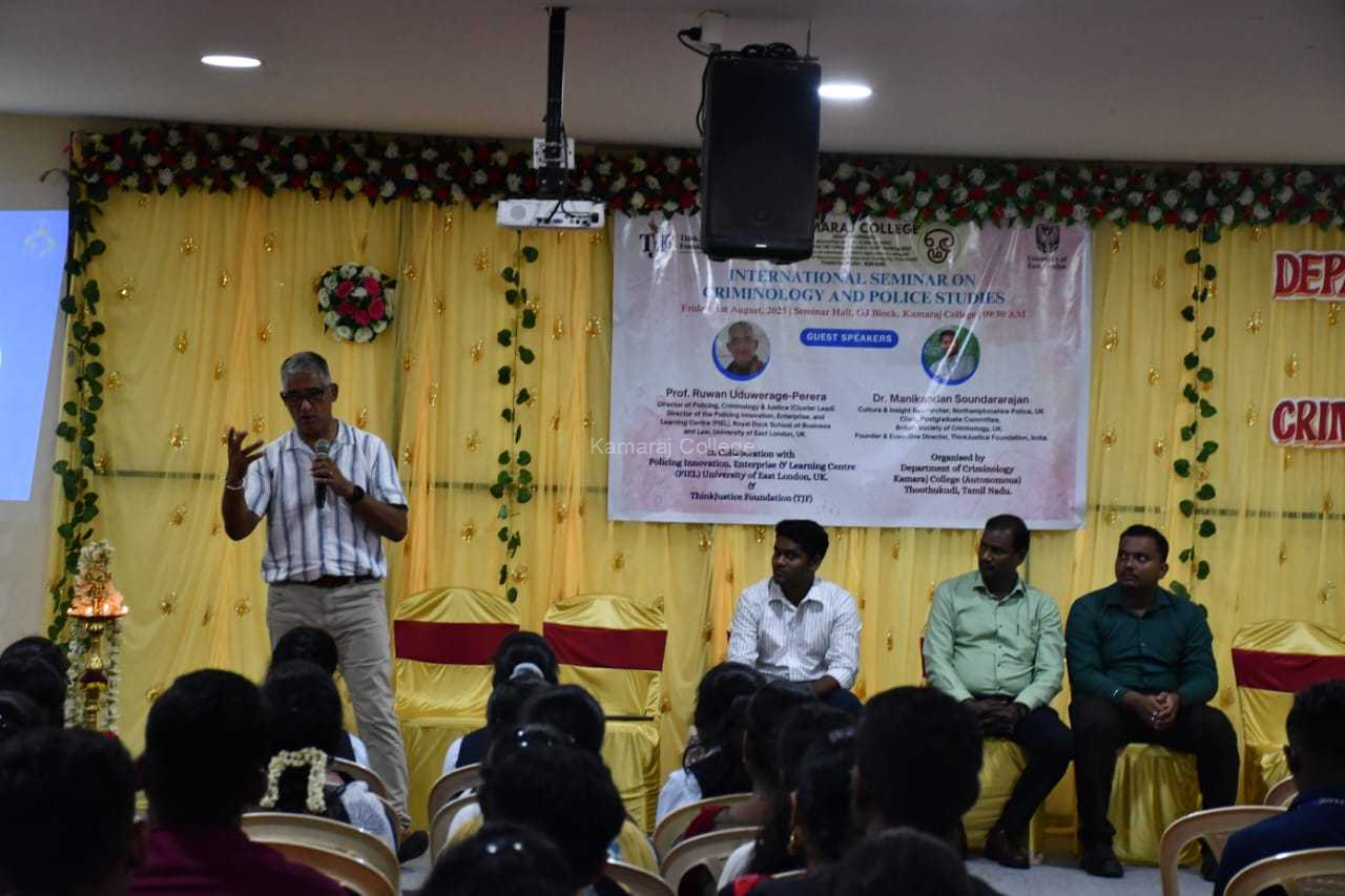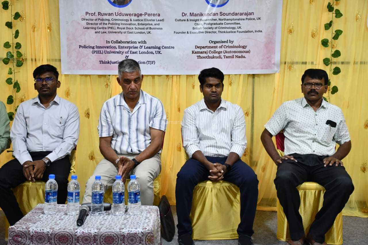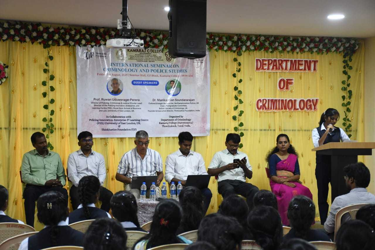 The Department of Criminology, Kamaraj College (Autonomous), Thoothukudi, hosted a dynamic and thought-provoking International Seminar on Criminology and Police Studies on 1st August 2025 from 9.30 AM to 4.30 PM at the Golden Jubilee Block. The event was conducted in academic partnership with the International Centre for Policing Innovation Enterprise and Learning (PIEL Centre), University of East London, UK, and the ThinkJustice Foundation, India.