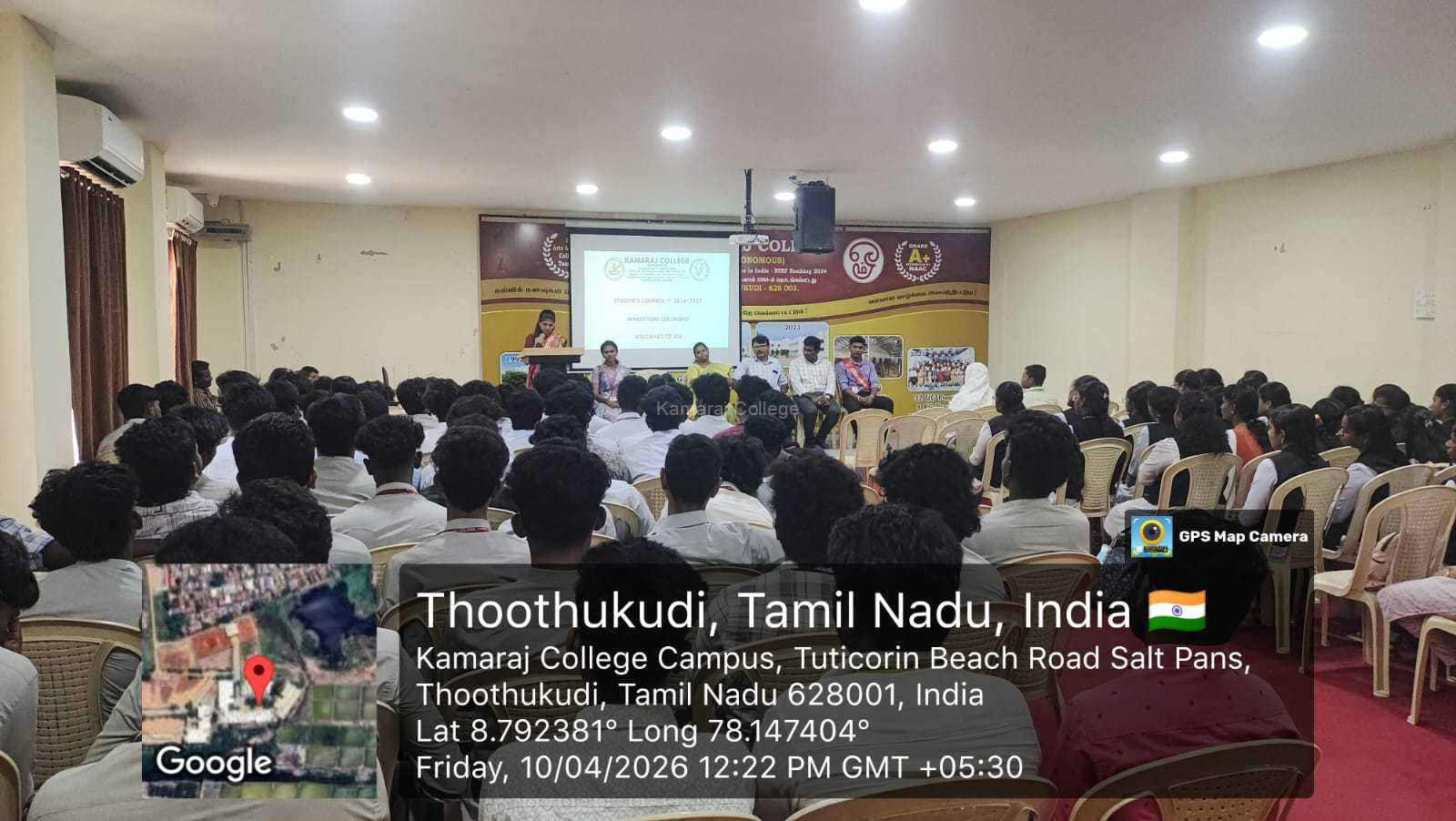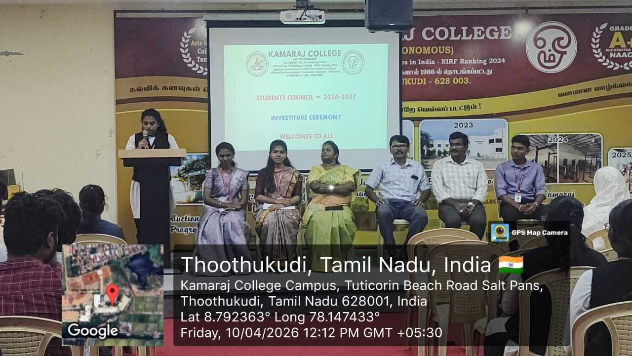 The Student Council Investiture Ceremony for the academic year 2026–2027 was conducted on 10 April 2026 from 11.30 a.m. to 01.00 p.m. at the Golden Jubilee Block of Kamaraj College (Autonomous), Thoothukudi.