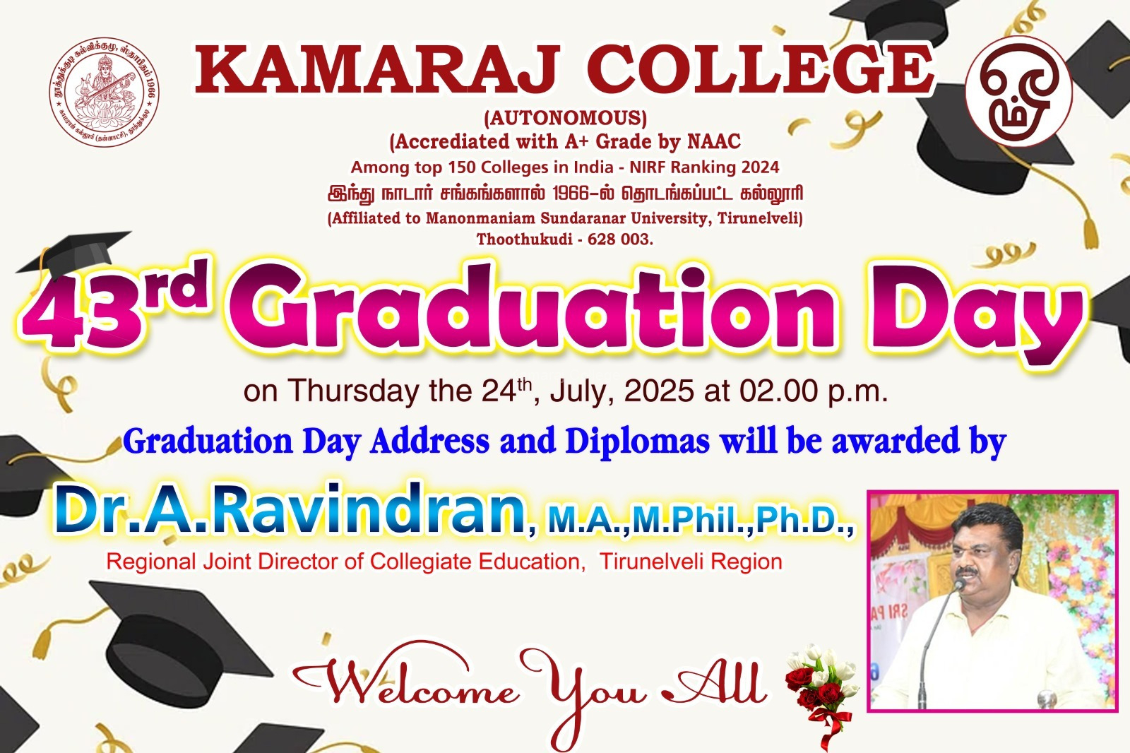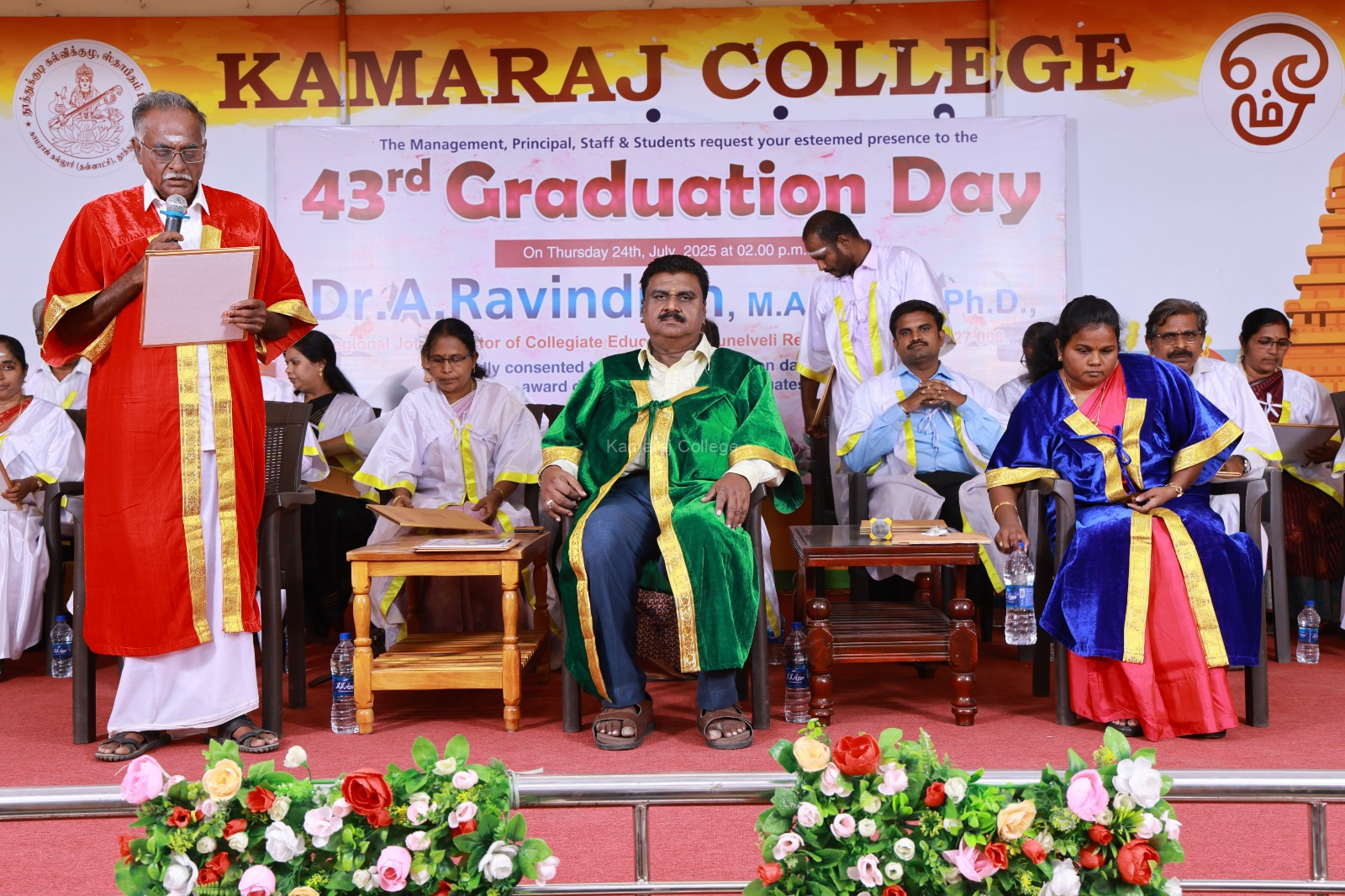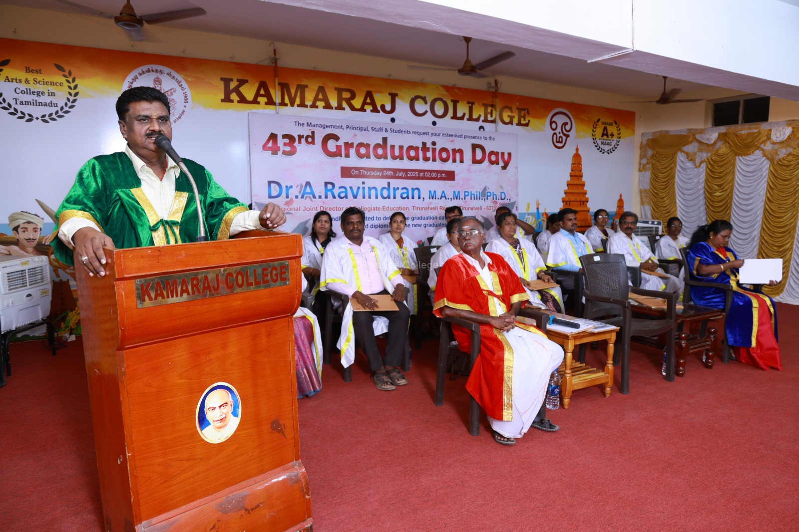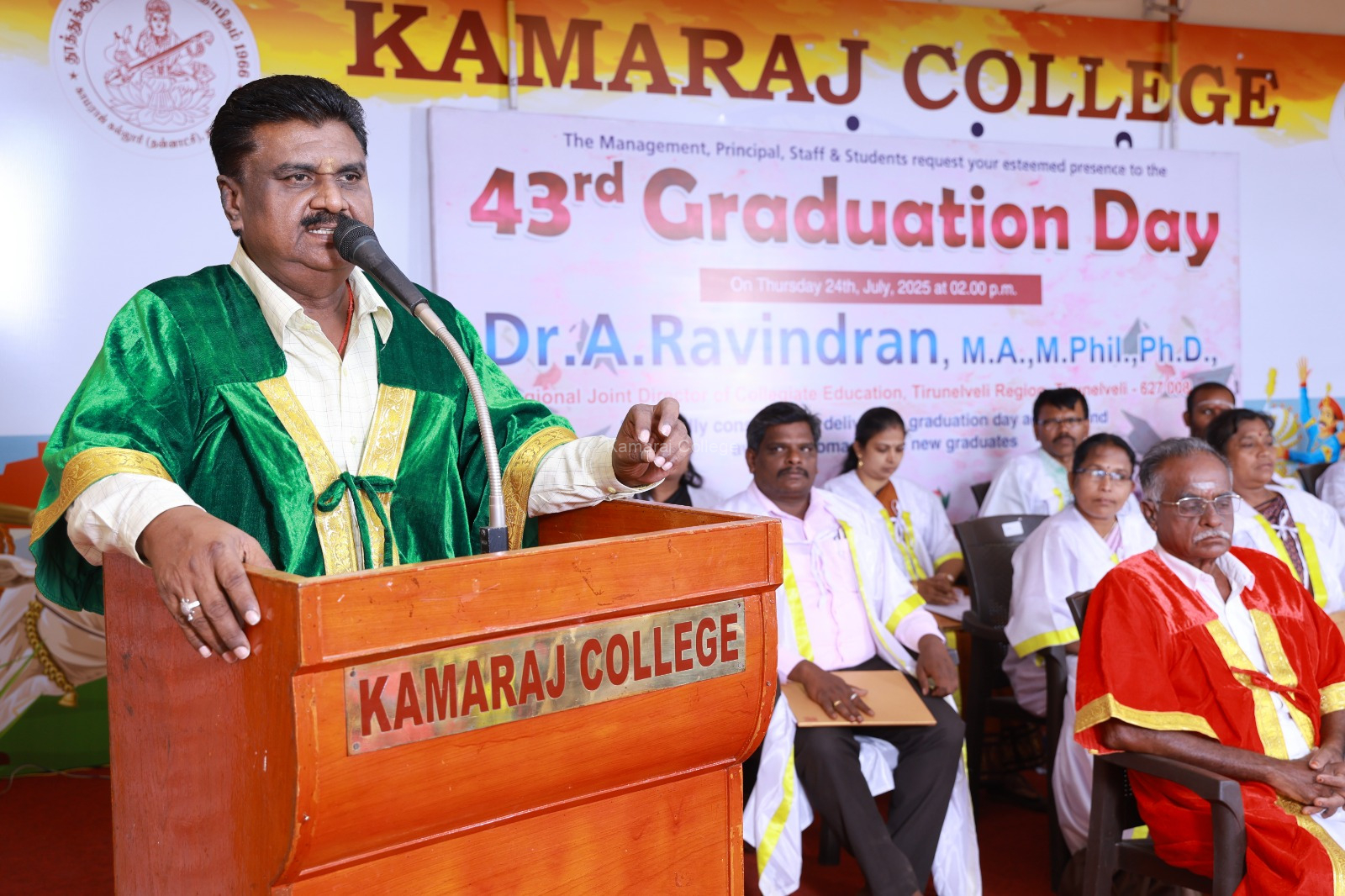 The ceremony welcomed Dr. A. Ravindran, Regional Joint Director of Collegiate Education, Tirunelveli, as the esteemed Chief Guest. His stirring speech during the Kamaraj College Graduation Day 2025 encouraged graduates to pursue lifelong learning and champion social responsibility. He reminded students that a degree is not just an academic credential, but a stepping stone to personal growth and contributing positively to society.