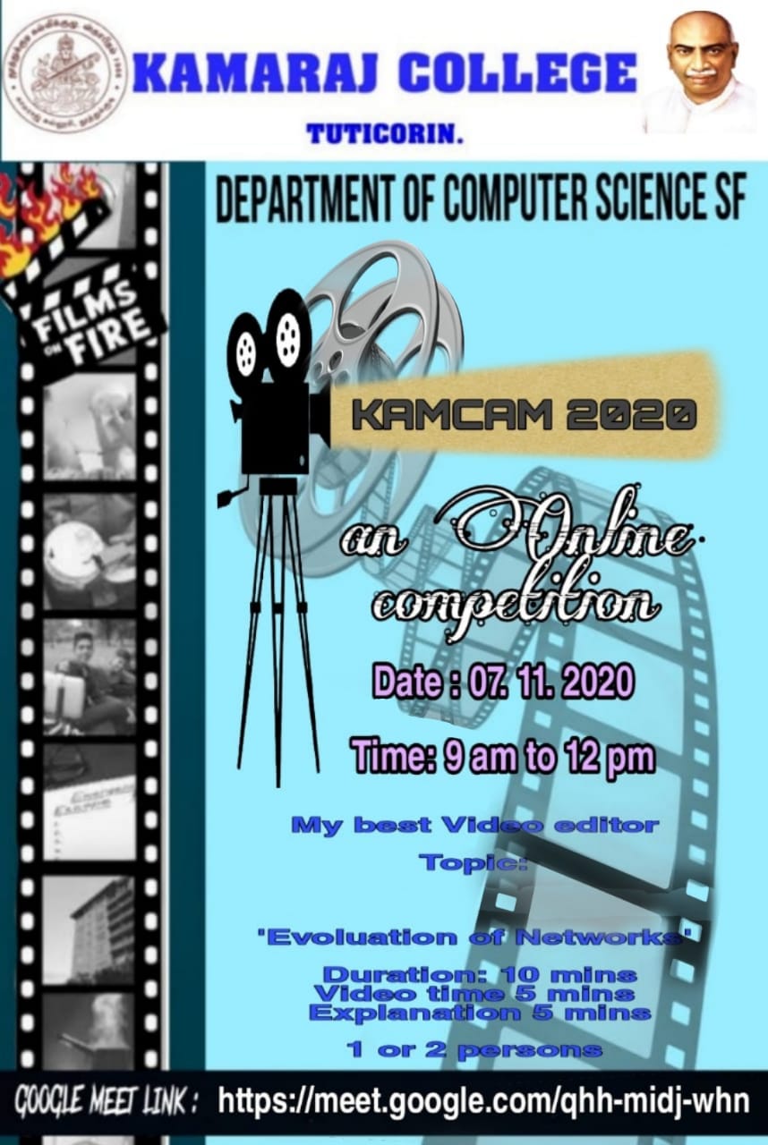 Second Kamcam1 Association Meet Competition 2020 was organized by the Department of Computer Science (SF) on 07.11.2020 for the second year students on the topic: “My best Video editor” with the duration of 10 mins and to explain video editing tools with the topic “Evolution of Networks”. This competition meeting was conducted in Google meet. 50 participants attended the meeting. Live Streaming was done in YouTube
