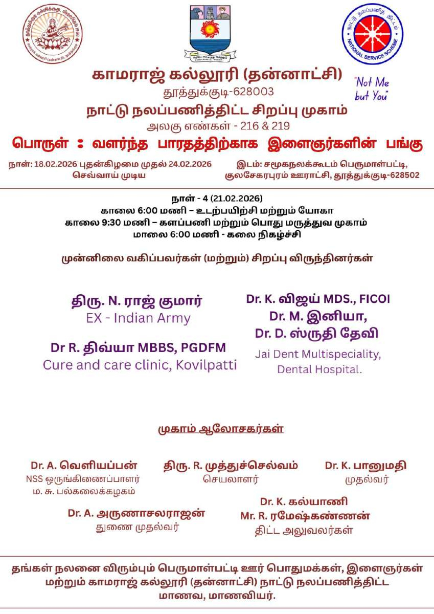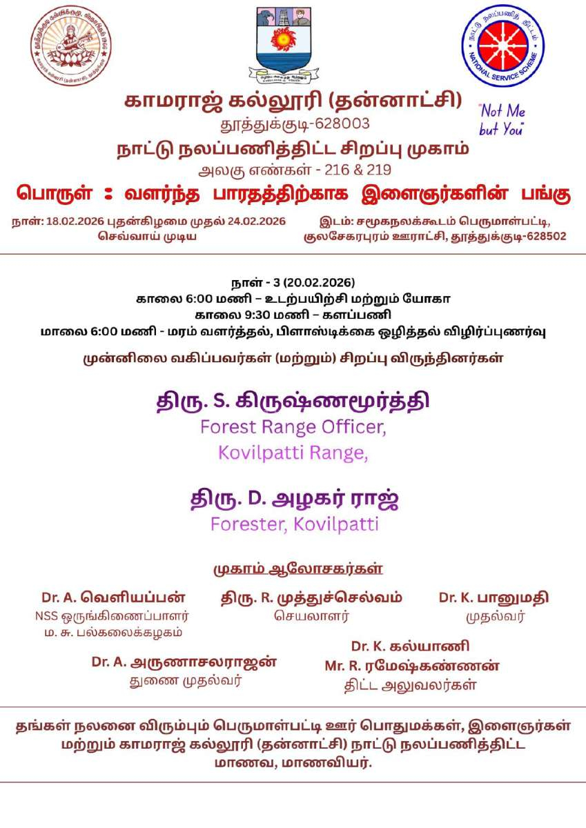 From 18 February 2026 to 24 February 2026 (07.00 a.m. – 06.00 p.m.), the NSS Special Camp was organized by NSS Units 216 and 219 of Kamaraj College (Autonomous), Thoothukudi at Perumalpatti village.