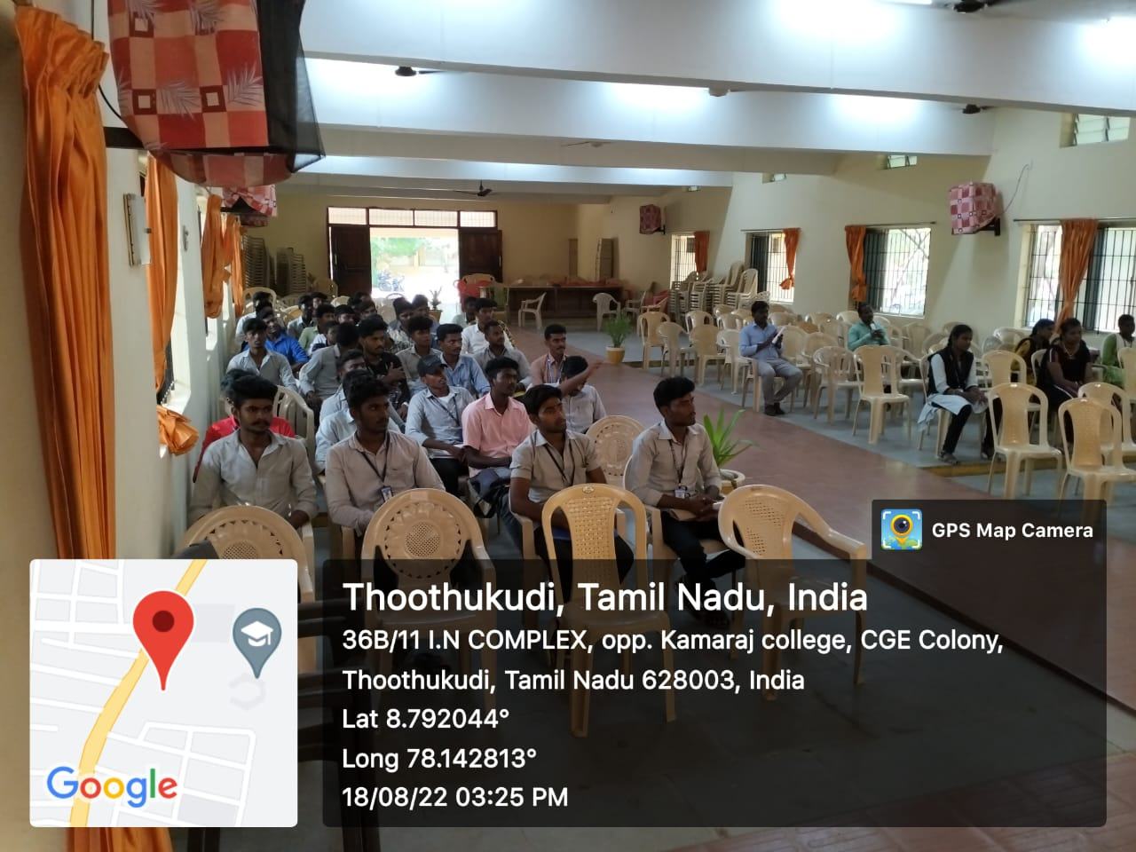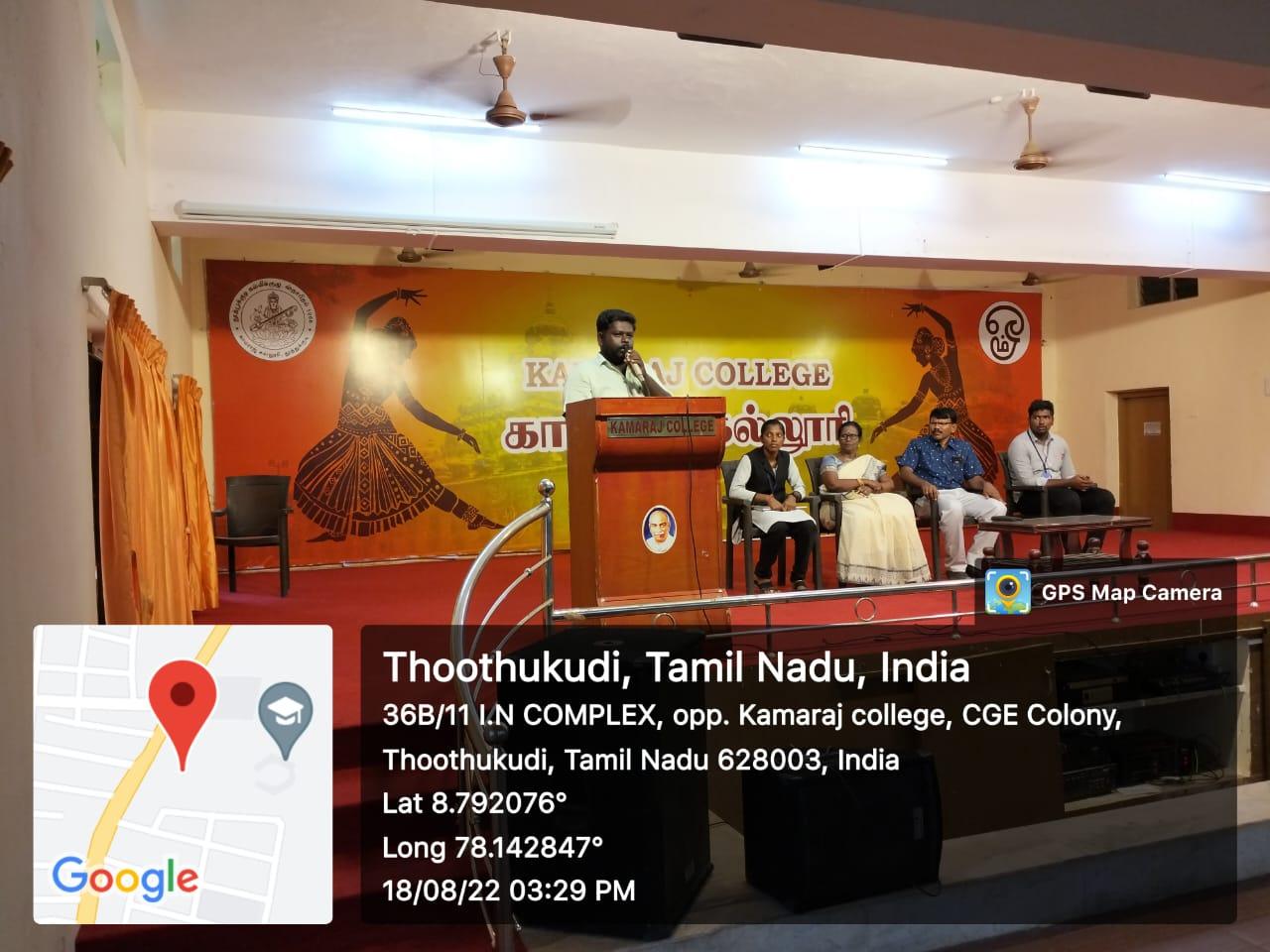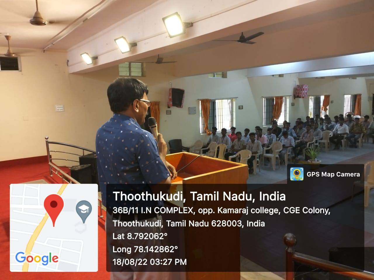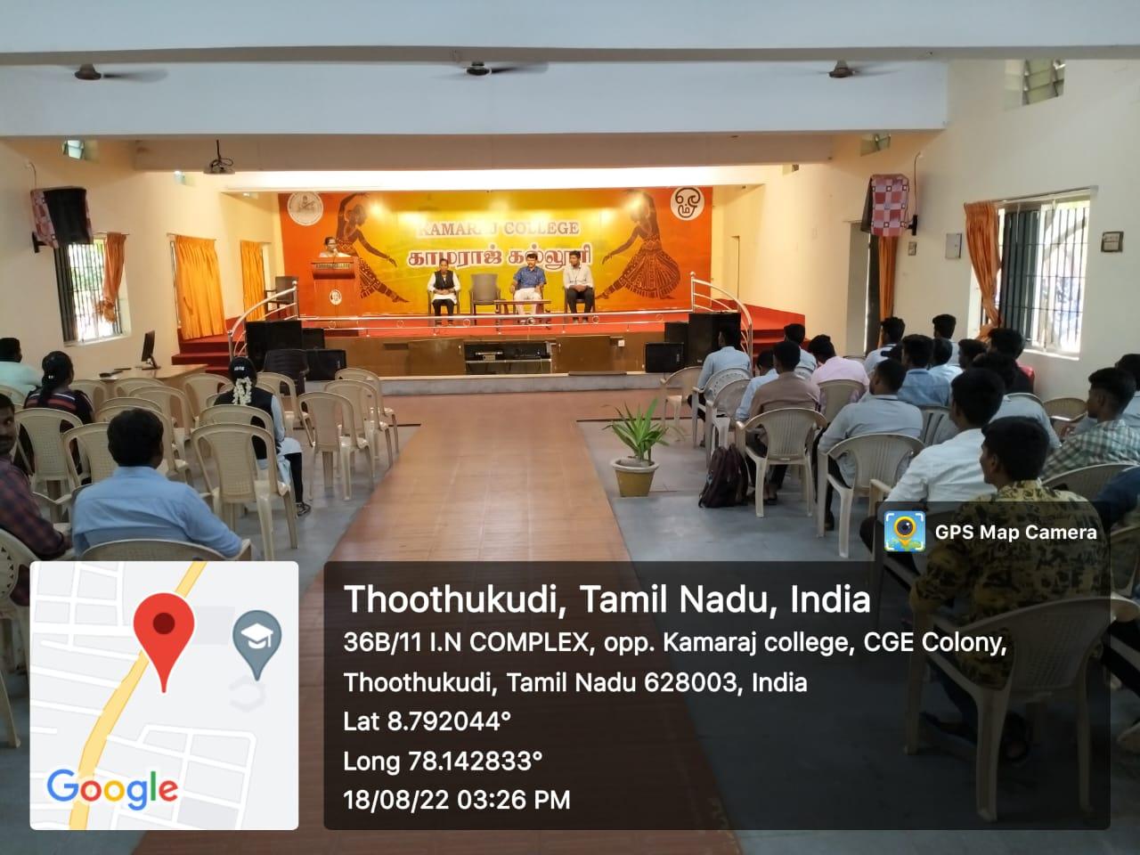 The placement cell of Kamaraj College organized the Police Training Programme on August 18,2022 in Kamarajar Kalvi Arangam. The session started at 3 pm with Tamil Thaai Vaazhthu. Dr. A. Devaraj, Placement Coordinator welcomed the gathering. Master of ceremony was skillfully done by Ms. Yogavalli of III BA criminology. Dr. J. Poongodi Principal in-charge & Dr A. Arunachala Rajan vice principal motivated the students to crack the police exam. This programme was very useful to the students. Finally the vote of thanks was given by Mr. J. Alangara Ashok, placement Coordinator(SF) who organised the event. The programme came to an end with the National Anthem.