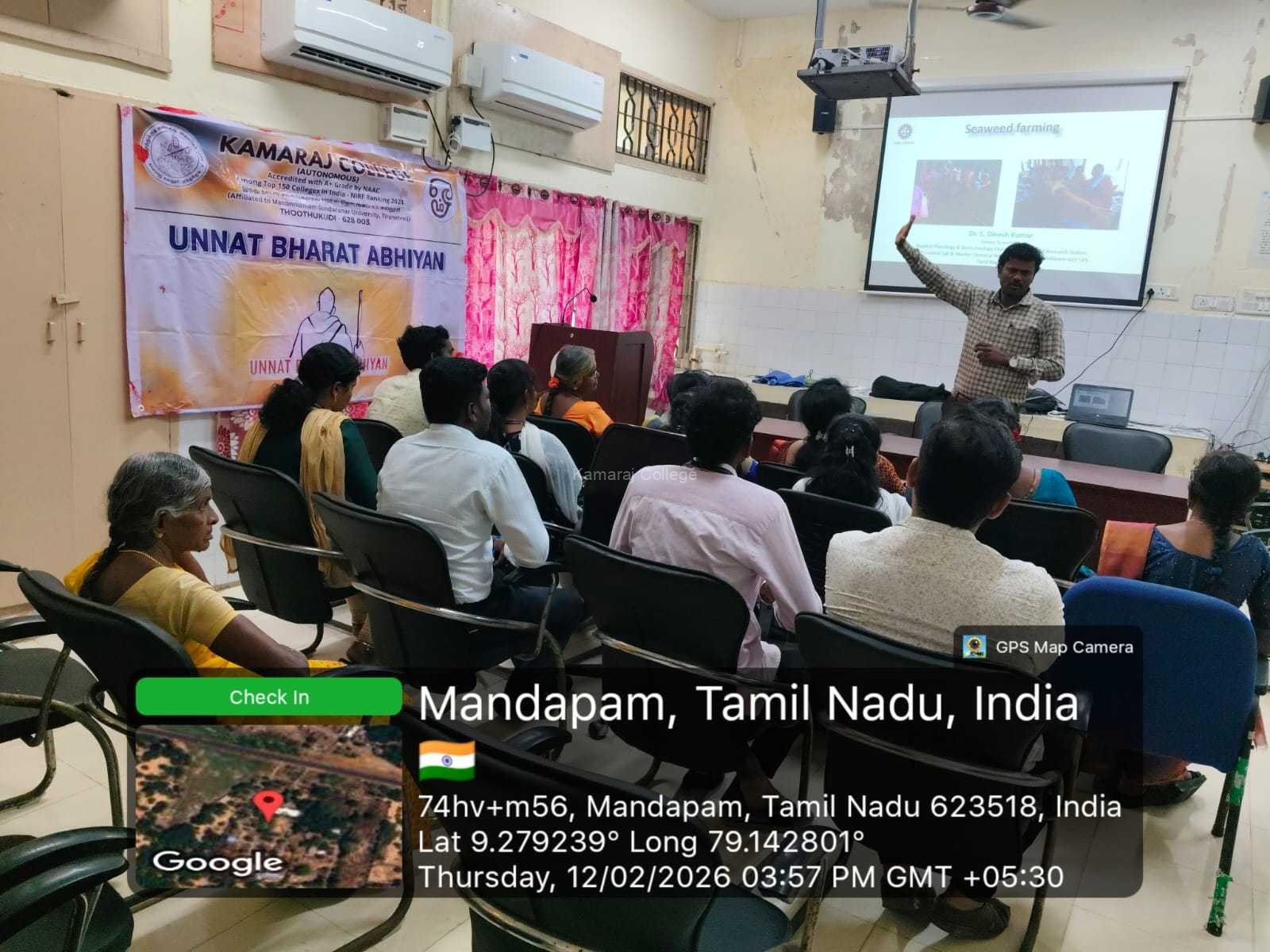 The Seaweed Commercial Training programme was organized on 12 February 2026, from 10.30 a.m. to 02.00 p.m., under the Seaweed Project of Unnat Bharat Abhiyan by Kamaraj College (Autonomous), Thoothukudi.