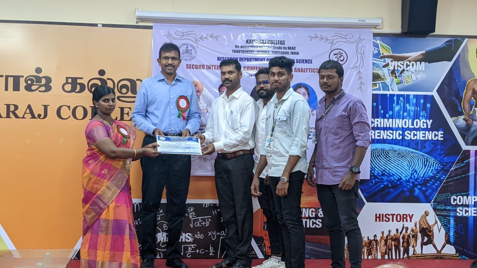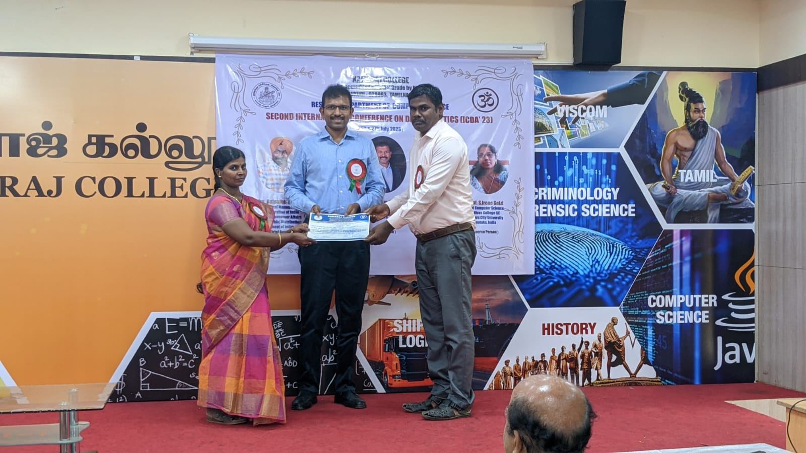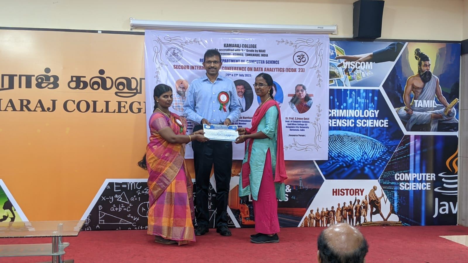 The Research Department of Computer Science, Kamaraj College organised Second International Conference on Data Analytics (ICDA’23) [Hybrid Mode] on 26th & 27th July 2023. On the first day, 26th July 2023, the inaugural function was begun at 9:30 AM with the invocation song of the Tamil Thai Vazhthu. The Honourable Principal of the Kamaraj College Dr.J.Poongodi presided over the function by lighting the standing lamp with other dignitaries. Dr. V. Joseph Raj, Head, Research Department of Computer Science delivered the welcome address. Dr.J.Poongodi, Principal of the Kamaraj College delivered the presidential address. The chief guest Thiru. Bafpalbir Singh, Divisional Manager, Food Corporation of India (Ministry of Consumer Affairs, Food and Public Distribution), Government of India, inaugurated the conference in the presence of Thiru.R.Muthselvam, correspondent, Kamaraj Women’s College and delivered the Inaugural Address. Dr.A.Asok, Vice Principal offered felicitation. The inaugural session ended with the vote of thanks proposed by Dr. V. Joseph Peter, Associate Professor of Computer Science followed by the start of the first day two technical sessions. Mr.Samuel Jigme Harrison, VLSI Professional, Senior IEEE Member, Singapore, and Dr.Prof.M.Safish Mary from St.Xaviers College, Tirunelveli acted as the resource persons and delivered the Keynote Address on IOT Analytics and Deep Learning Techniques. Around 180 participants from various colleges have actively participated and researchers were presented their research in Day 1 Offline mode sessions of ICDA ’23. On the second day, 27 July 2023, the third technical session was started with the delivery of a keynote address on Machine Learning Techniques by Dr.Prof.S.IRENE GETZI, Jyoti Nivas College (A), Bengaluru City University, Karnataka. Sessions were organized in Online mode and papers were presented by Scholars, industrialists, Faculties, and PG Students from different districts and states like Karnataka, Bangalore and Delhi. Around 70 research papers were presented at the Conference in both offline and online mode. Finally, the valedictory function was started by 3.30 PM. Prof. T. Ravi, Associate Professor of Computer Science delivered the welcome address. Dr.S.Senthil, Assistant Professor of Computer Science introduced the chief guest. The chief guest Dr. A. Duraisamy, Dean, SRM University, Chennai delivered the valedictory address. The Conference came to an end with a vote of thanks by Dr. M. Gethsiyal Augasta, Assistant Professor of Computer Science. The Conference was sponsored by the Management of Kamaraj College, ICT Academy (Tamilnadu), Postulate Info. Tech Pvt. Ltd (Thoothukudi), QTick Technology Pte. Ltd. (Singapore), Mrs. T. Raja Rajeshwari (FCI) and Mr. B. Saravana Babu (District Officer, FRS). By this Conference, ICDA ’23, around 300 students and research persons benefited for directing their studies and research in the right direction. The faculty members and Student volunteers of the Research Department of Computer Science organized the Conference in a successful manner.